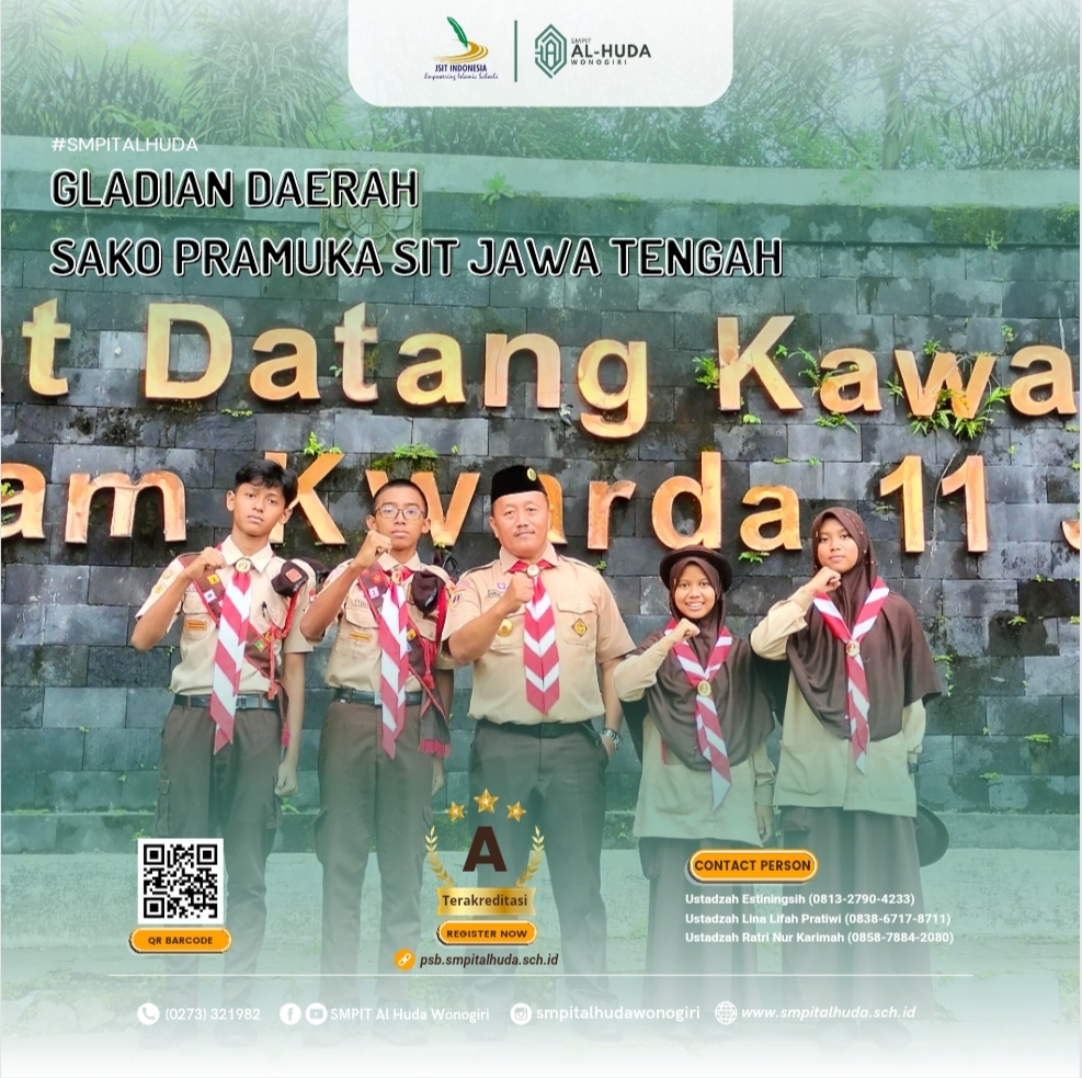 Wonogiri, 31-1 Januari-Februari 2023, Pada Hari Selasa dan Rabu SMPIT Al Huda Wonogiri mengikuti acara Gladian Daerah. Gladian Daerah dilakukan di Semarang di Buperta Candra Birawa. Acara ini diikuti oleh pinru dan wapinru regu kemnas dari masing-masing daerah. Perwakilan dari Espida yaitu Dzaky (9A), Faris (8B), Sena (9D), Eltandisty (8C).