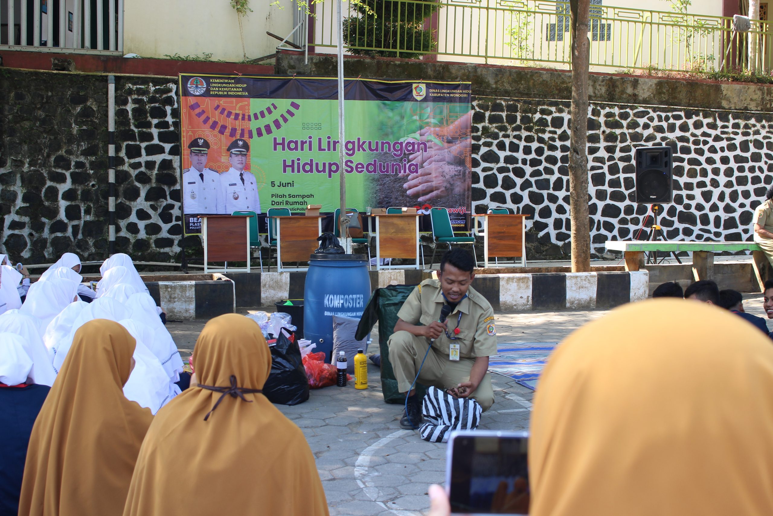 Diawali dengan tasmi’ oleh Muhammad Aziz Fadilah Akbar lalu sambutan. Sambutan yang pertama dari Ustadz Adi Suwito S.Pd.I. dan yang kedua dari Drs. Bahari M.Si ( Kepala DLH). Setelah sambutan, dilanjut dengan acara inti oleh Bu Ariyani. Definisi sampah menurut UU no 18 tahun 2008, sampah adalah sisa sehari-hari manusia/proses alam yang berbentuk padat. Perhari sampah di Wonogiri bisa mencapai 370 ton. Dan pada tahun 2022 Wonogiri dapat mencapai 135.050 ton. Setelah materi pertama selesai seluruh siswa mencari sampah lalu dikumpulkan. memungut sampah dilkukan pada pukul 09.10-09.30.