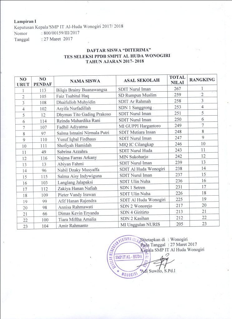 Lampiran SK Kepala Sekolah SMPIT Al Huda Wonogiri